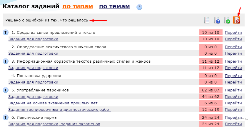 Такой сервис есть: в каталоге заданий есть кнопка (отметили на скриншоте ниже). Она позволяет открыть задания, которые решались, но в которых были допущены ошибки. Но лучше решать персональные варианты с главной страницы: в них будут задания, в которых вы допускали ошибки, правильно настроенное добавление ранее нерешенных заданий и т. д.
